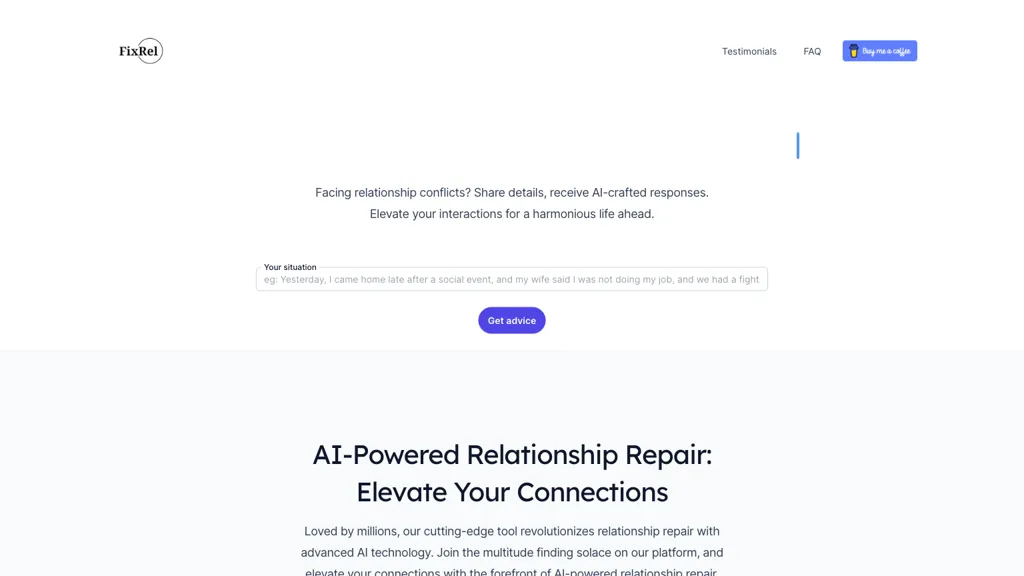 FixRel is an AI-powered relationships assistant, it helps with relationship repair using advanced AI technology.By simply inputting details of a conflict or expressing feelings, users can receive AI-crafted responses to navigate smoother communication.