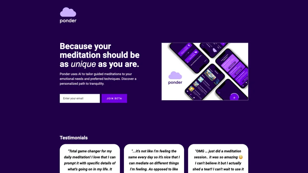 Ponder is an AI-powered meditation tool that tailors guided meditations to your emotional needs and preferred techniques. Personalized for a unique path to tranquility, Ponder offers guided meditations based on your current emotions, situation, and meditation technique preferences.