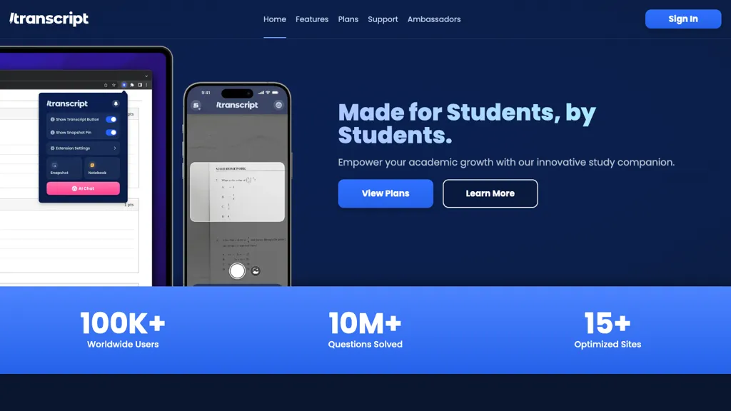 Transcript is an innovative AI study companion designed to empower academic growth for students worldwide. With over 100k users and 10m+ questions solved, Transcript offers one-click problem and question solving, providing detailed solutions to enhance understanding of complex concepts and improve problem-solving skills. Optimized for 15 popular learning platforms, Transcript’s next-generation AI engine ensures precise solutions and guidance for various subjects. Its intuitive tools, such as snapshot and text selection, simplify searching and tackling math and visual problems. Accessible via mobile app and notebook, Transcript allows users to organize notes, study materials, and seamlessly sync their knowledge across devices. Customizable plans starting from $7.99/month cater to different study needs, making Transcript a valuable study aid for students seeking academic success.