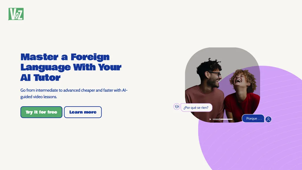 Master a foreign language with Voz, your AI tutor for intermediate to advanced levels, offering AI-guided video lessons for accelerated learning.Practice Spanish, French, German, Japanese, Italian, Portuguese, Korean, and upcoming languages like Chinese, Hindi, and English.